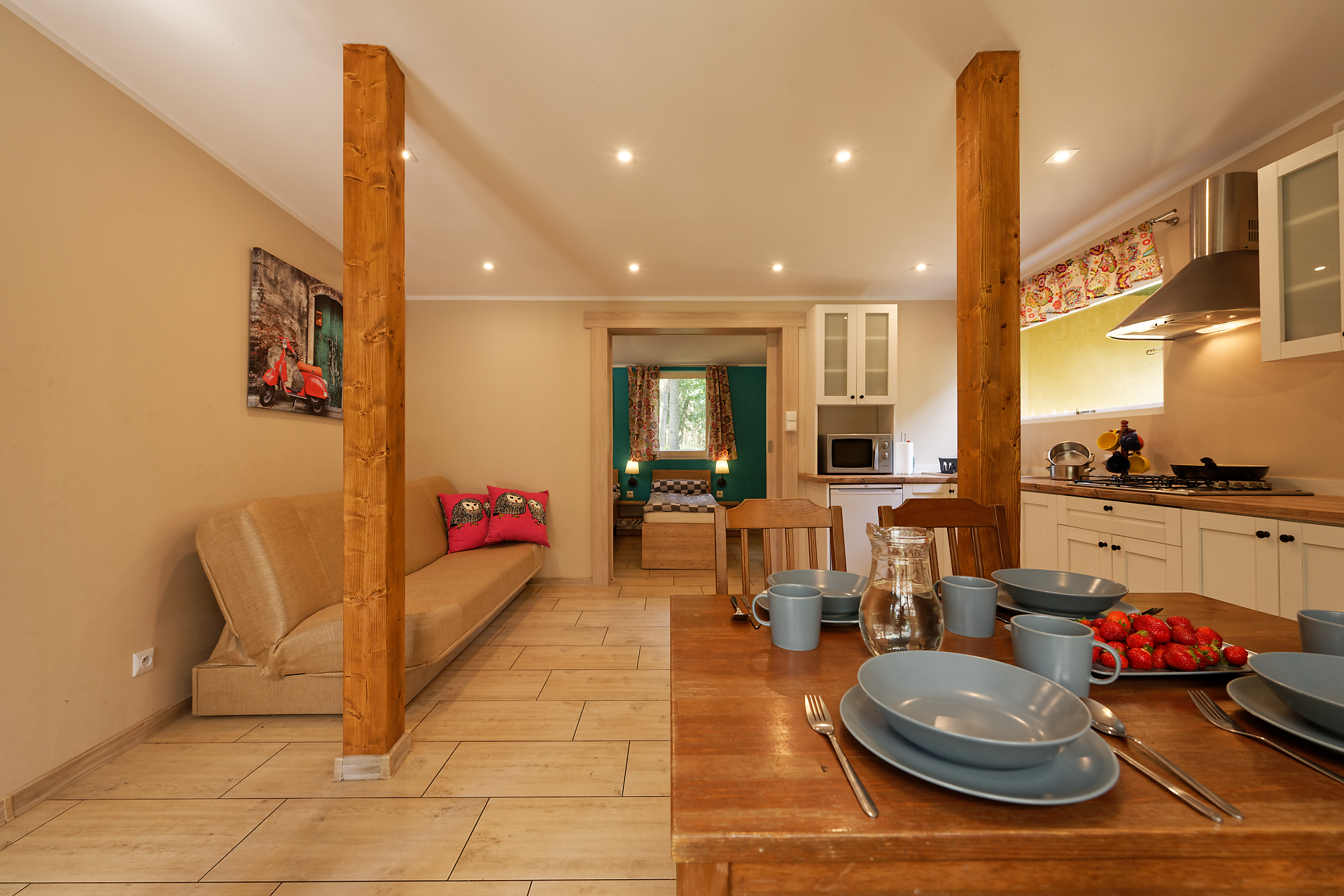 Posiada pokój gościnny z aneksem kuchennym z podwójną sofą do spania, sypialnię z podwójnym łóżkiem małżeńskim i łóżkiem pojedyńczym oraz łazienkę z prysznicem, jak również przestronny taras.